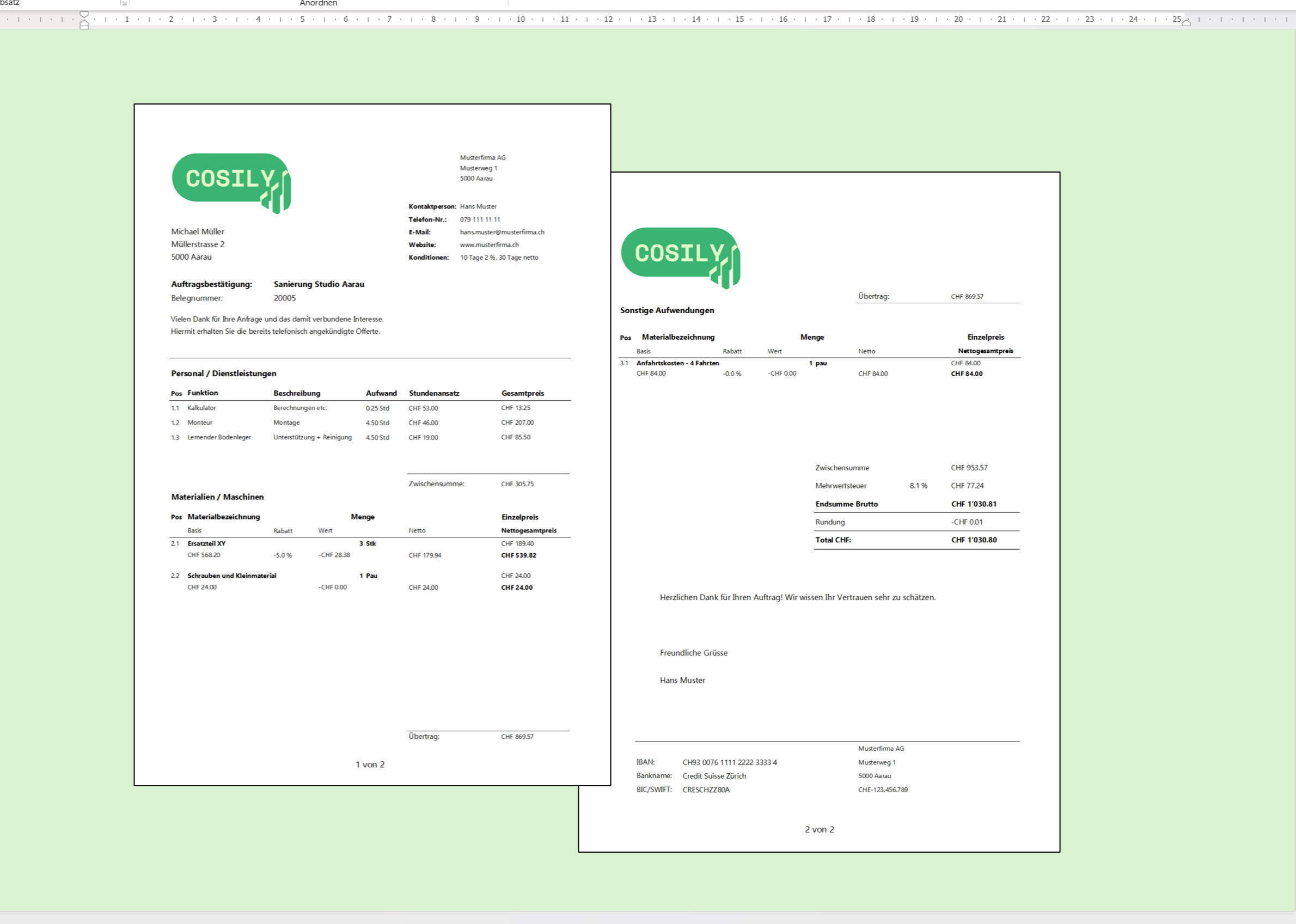 Im Hintergrund alles berechnet, im Vordergrund perfekt formatiert: Dein Dokument erscheint CI-konform, komplett vorausgefüllt und direkt versandbereit – ohne manuelles Nacharbeiten, einfach per Klick erstellt.