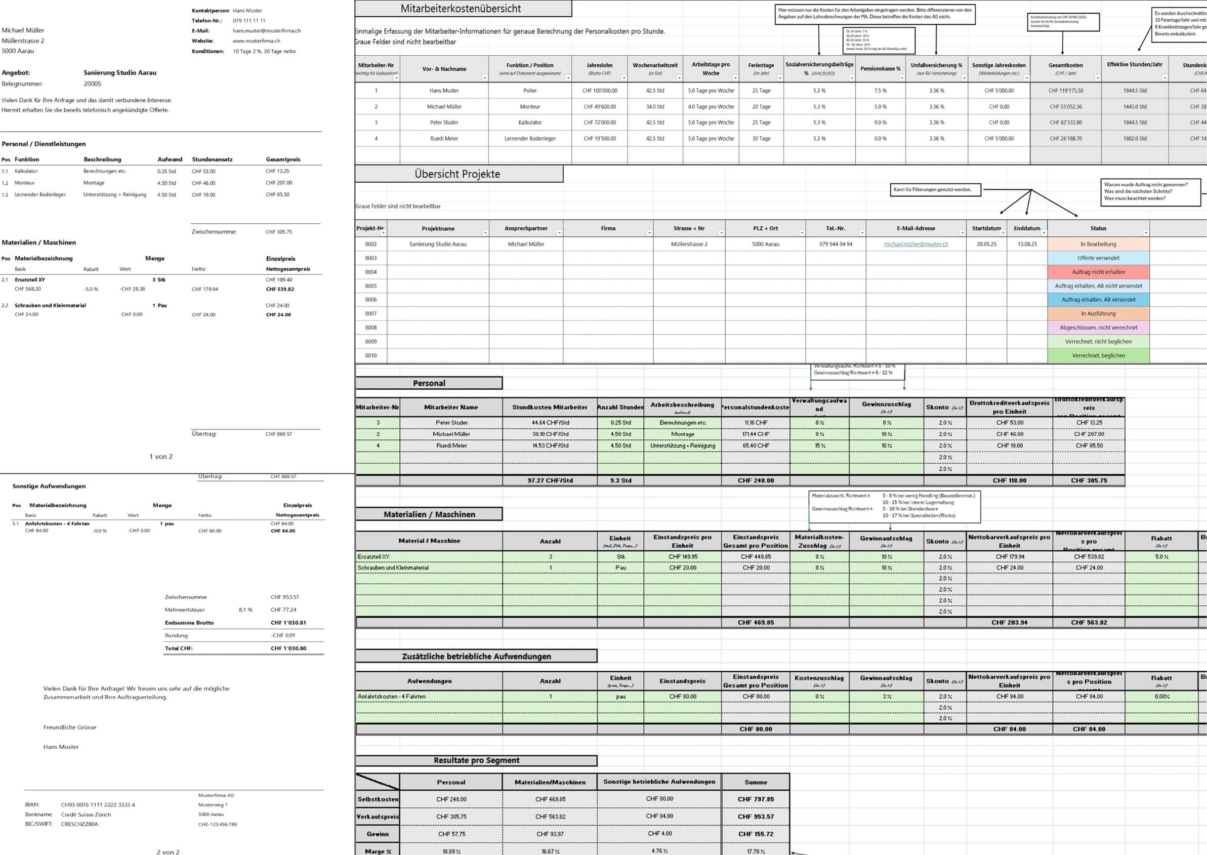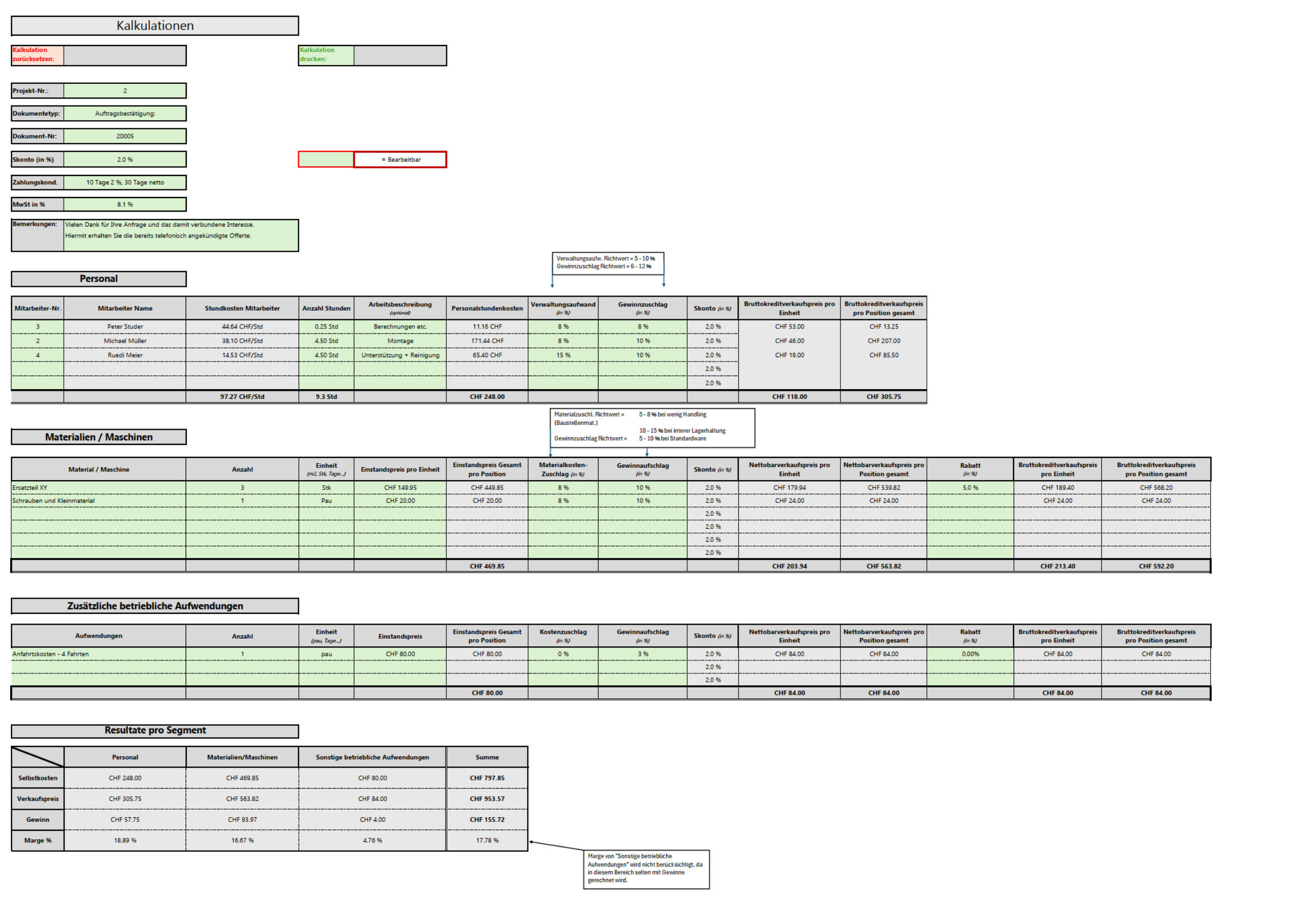 Die Kalkulationsmappe zieht automatisch alle nötigen Daten aus deinen Stamminfos, berechnet Preise und Margen in Echtzeit und gibt dir volle Kontrolle über alle Positionen – flexibel, transparent und effizient.