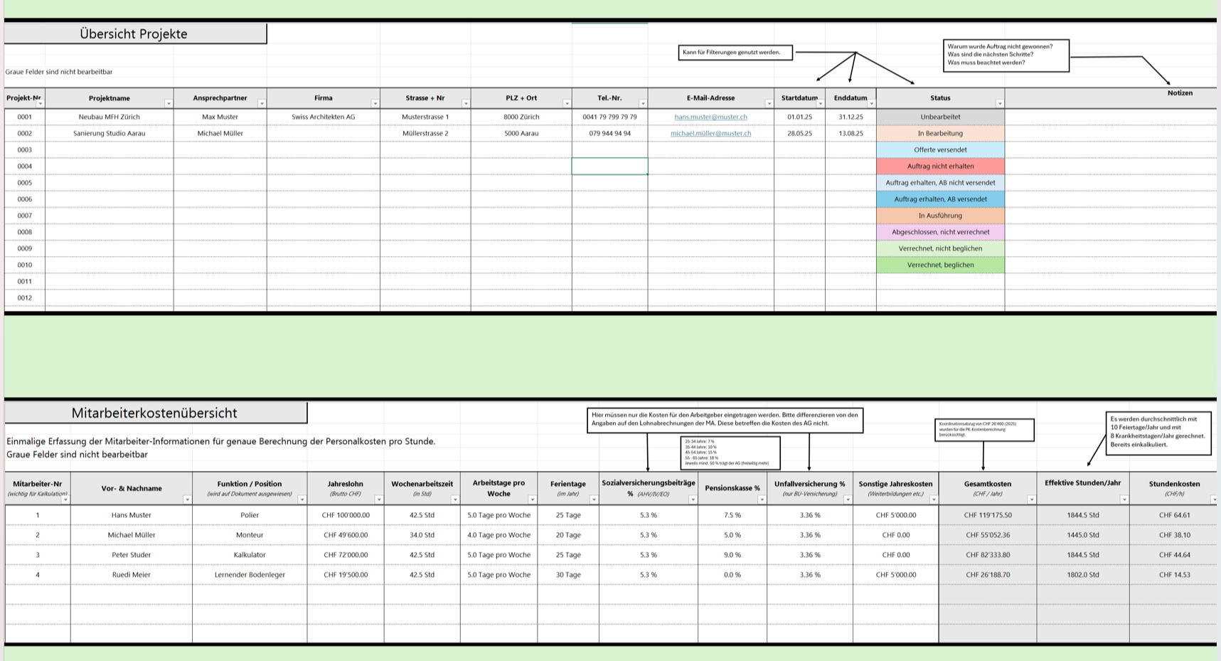 Ja, innerhalb der dafür vorgesehenen Felder kannst du alle relevanten Daten flexibel eintragen. Der Rest ist bewusst geschützt, damit Berechnungen und Formatierungen zuverlässig funktionieren. Wenn du spezielle Anpassungen brauchst, bieten wir ein Paket mit persönlichem Termin an.